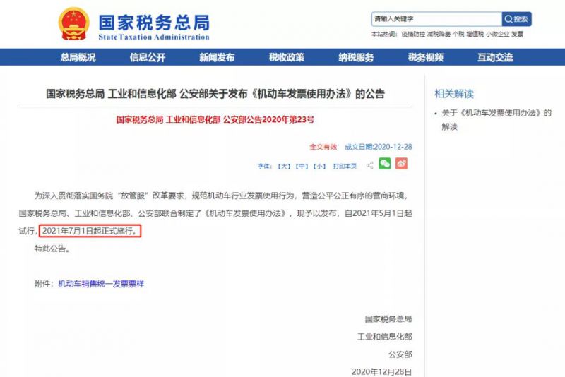 《機(jī)動車發(fā)票使用辦法》自2021年5月1日起試行,7月1日起正式施行。